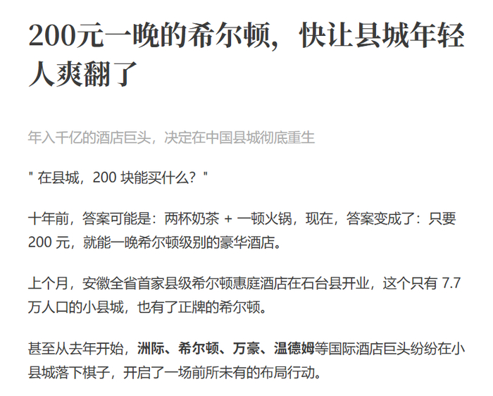 除此之外一些国际连锁酒店如希尔顿等主动下沉到三四线城市或县城,把平均房价打到了200元,这个价格已经比很多快捷酒店还要便宜了: