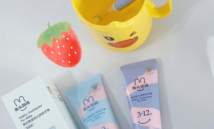 为大家推荐一款,含氟量符合国家标准和美国牙医学会推荐量的儿童牙膏兔头妈妈奥拉氟儿童牙膏,1 岁宝宝就能用!