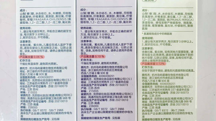 3~12 岁:牙膏中氟含量为0.10%,这个时期乳牙生长+换牙期,而且随着食物种类的增加,龋齿高发,所以氟含量有所增加。