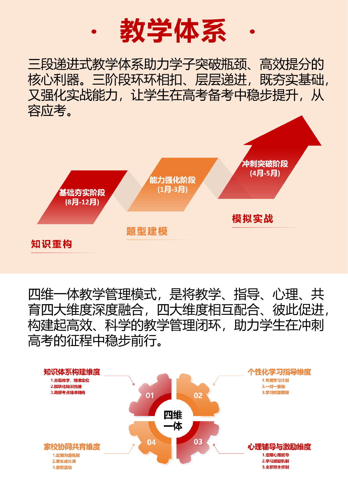 凭借成熟的教学模式和严格的管理制度,学校致力于帮助学生解决学习生活中的各种问题,从而顺利考上理想大学。该校采用小班授课和全封闭式管理,确保每位学生都能得到充分关注,学习效果明显。同时,学校强调系统化教学,在校期间提供科学的复习方法及备考技巧,助力学生在新一年的考试中取得优异成绩。