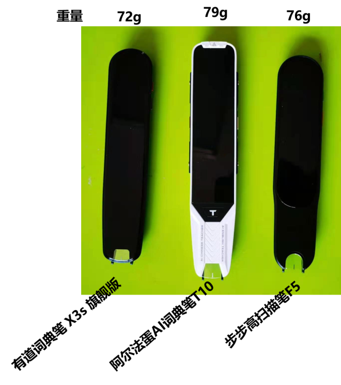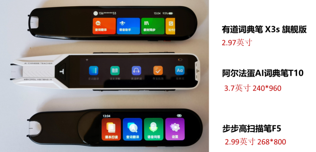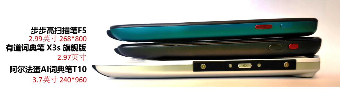 2. 屏幕大小:阿尔法蛋AI词典笔T10>步步高扫描笔F5>有道词典笔 X3s 旗舰版。