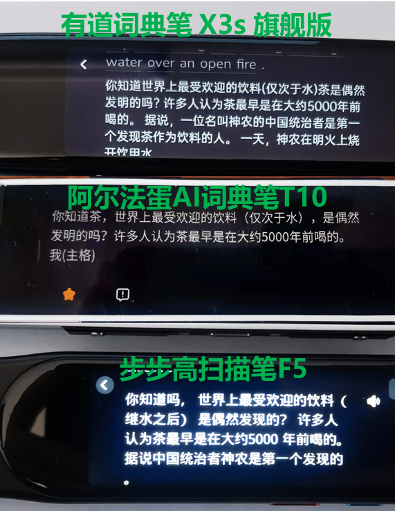 小结:扫读速度和准确率方面,阿尔法蛋AI词典笔T10>有道词典笔 X3s 旗舰版>步步高扫描笔F5。步步高扫描笔F5极个别的情况下会识别错误。