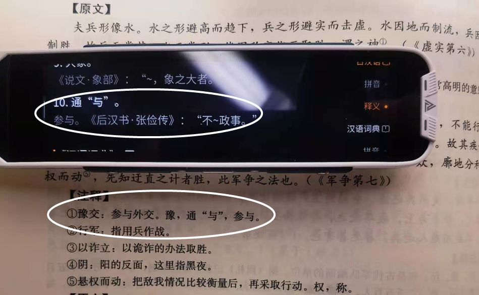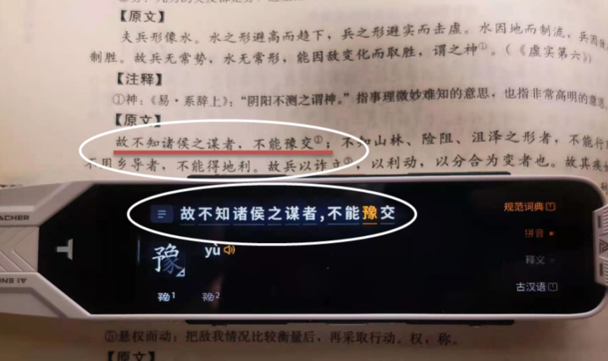 阿尔法蛋AI词典笔T10不限于英文,对中文的古诗词也有较为详尽的解释。例如,我扫描了《军争第七》一句:故不知诸侯之谋者,不能豫交。